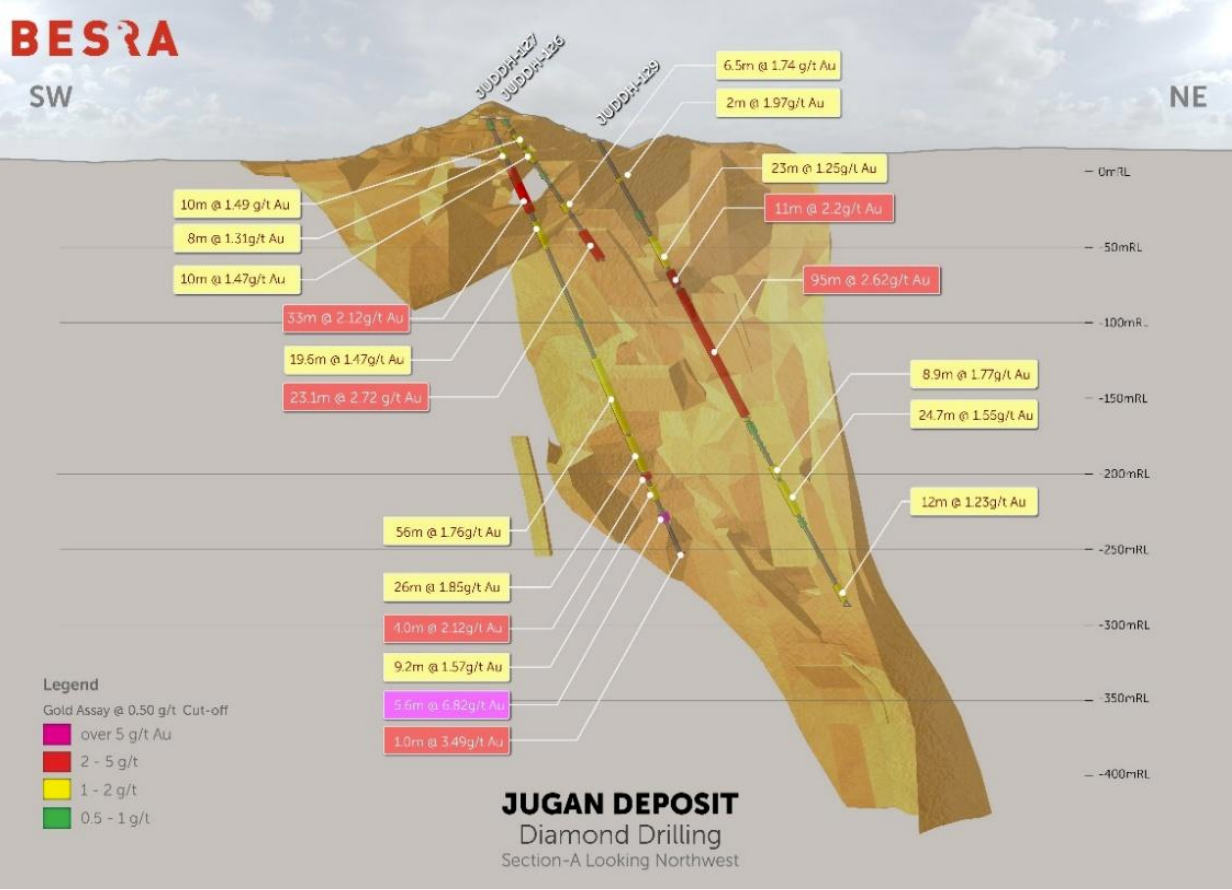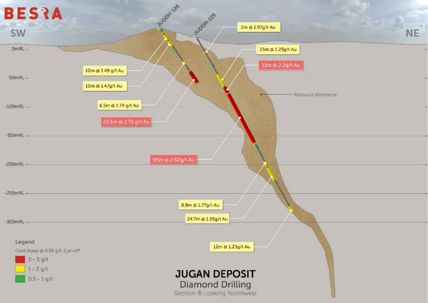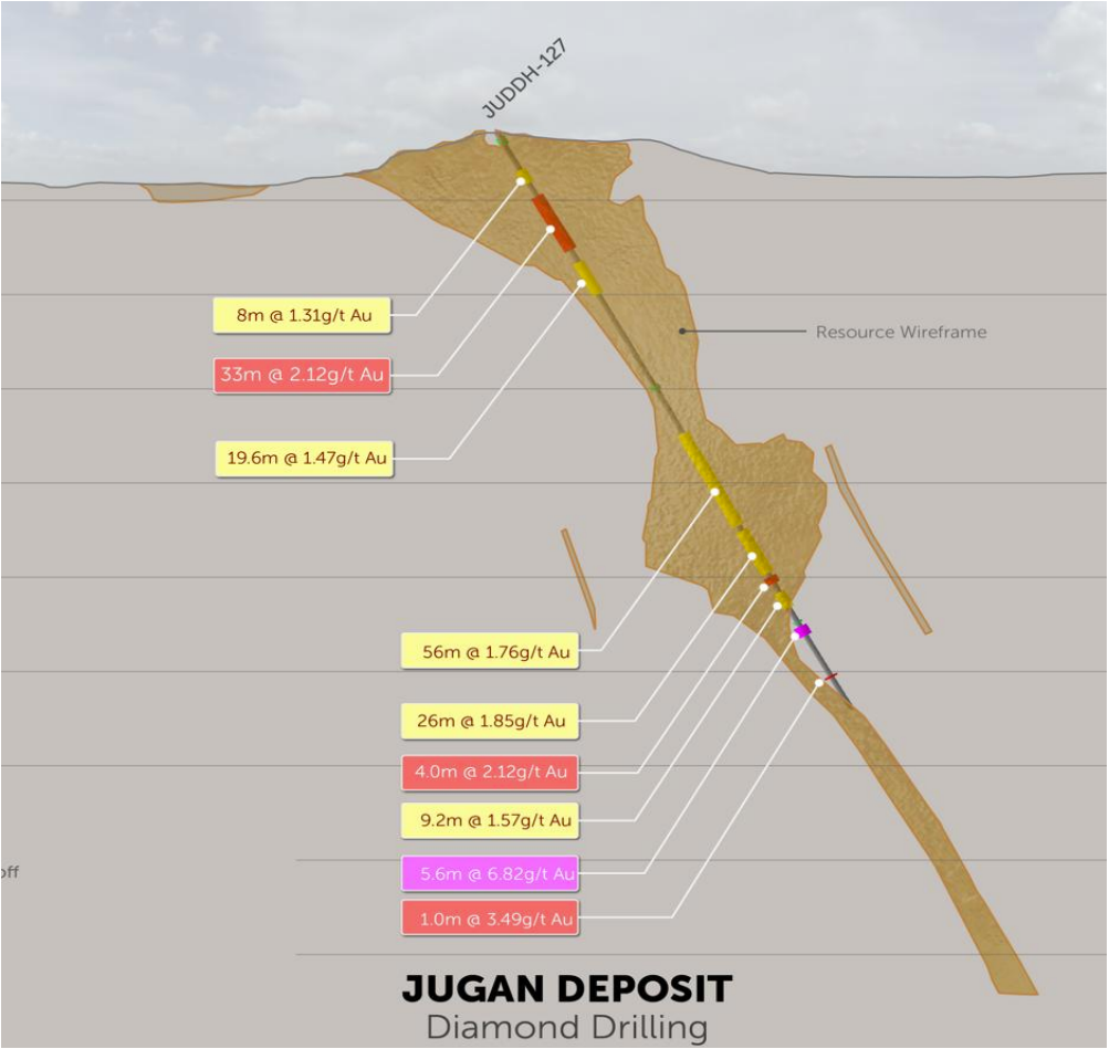 A three-hole 815.9m drill program (JUDDH-126, -127 & -129) has been completed to provide samples to assess variability of metallurgical recoveries and gold grades down-plunge of the Jugan Mineral Resource. This drilling has extended the gold mineralisation to a depth extent where the definition of an underground Mineral Resource may be warranted.