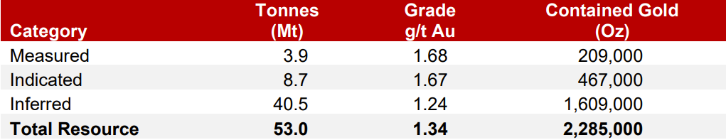 The updated Resource represents a decrease in the total contained gold and tonnage but, importantly, delivers an increase in both the Measured Resource and the overall grade.
